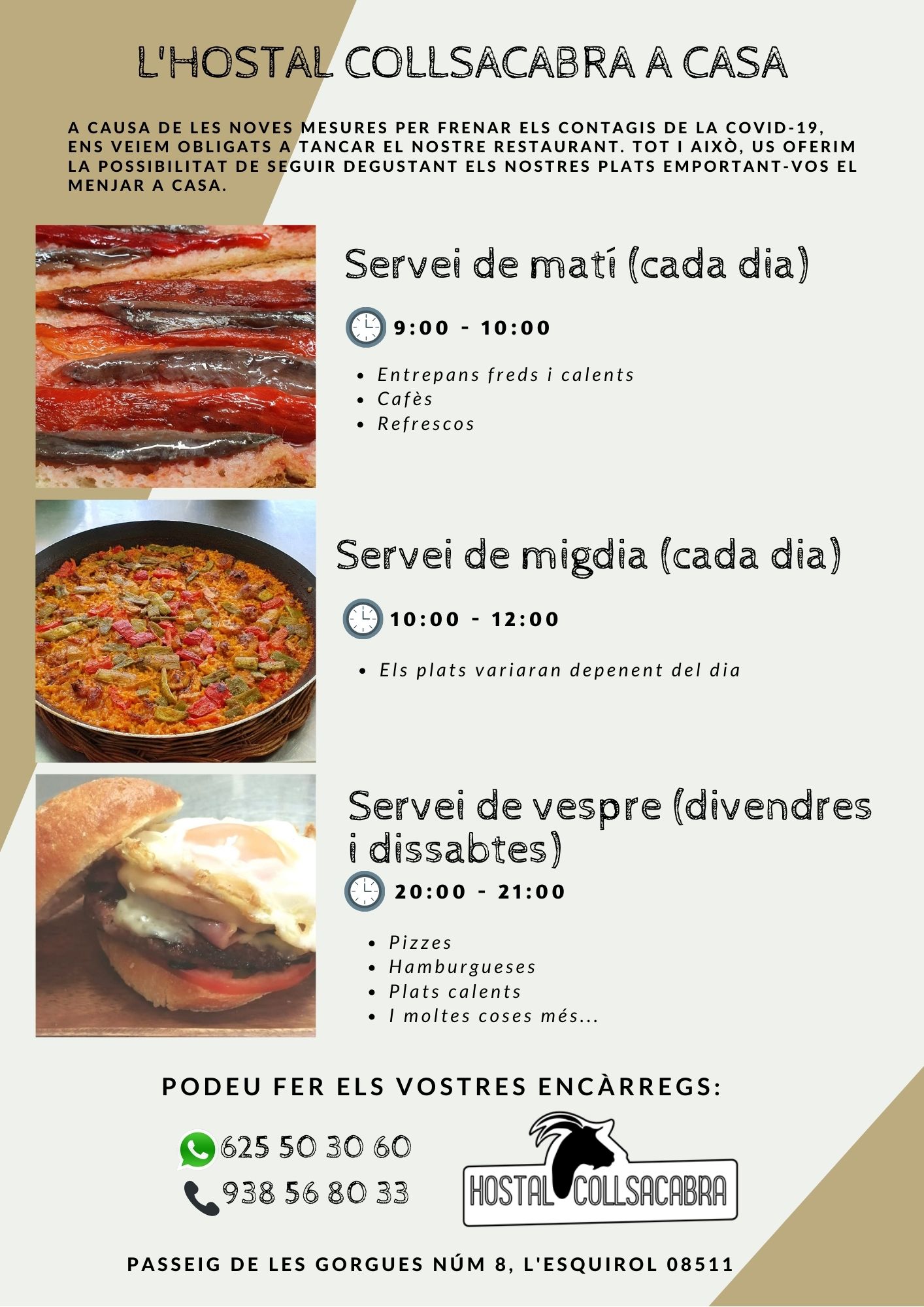 Per aquests dies, hem establert un horari per poder trucar i fer els vostres encàrrecs (els podreu venir a recollir quan vosaltres ho desitgeu):